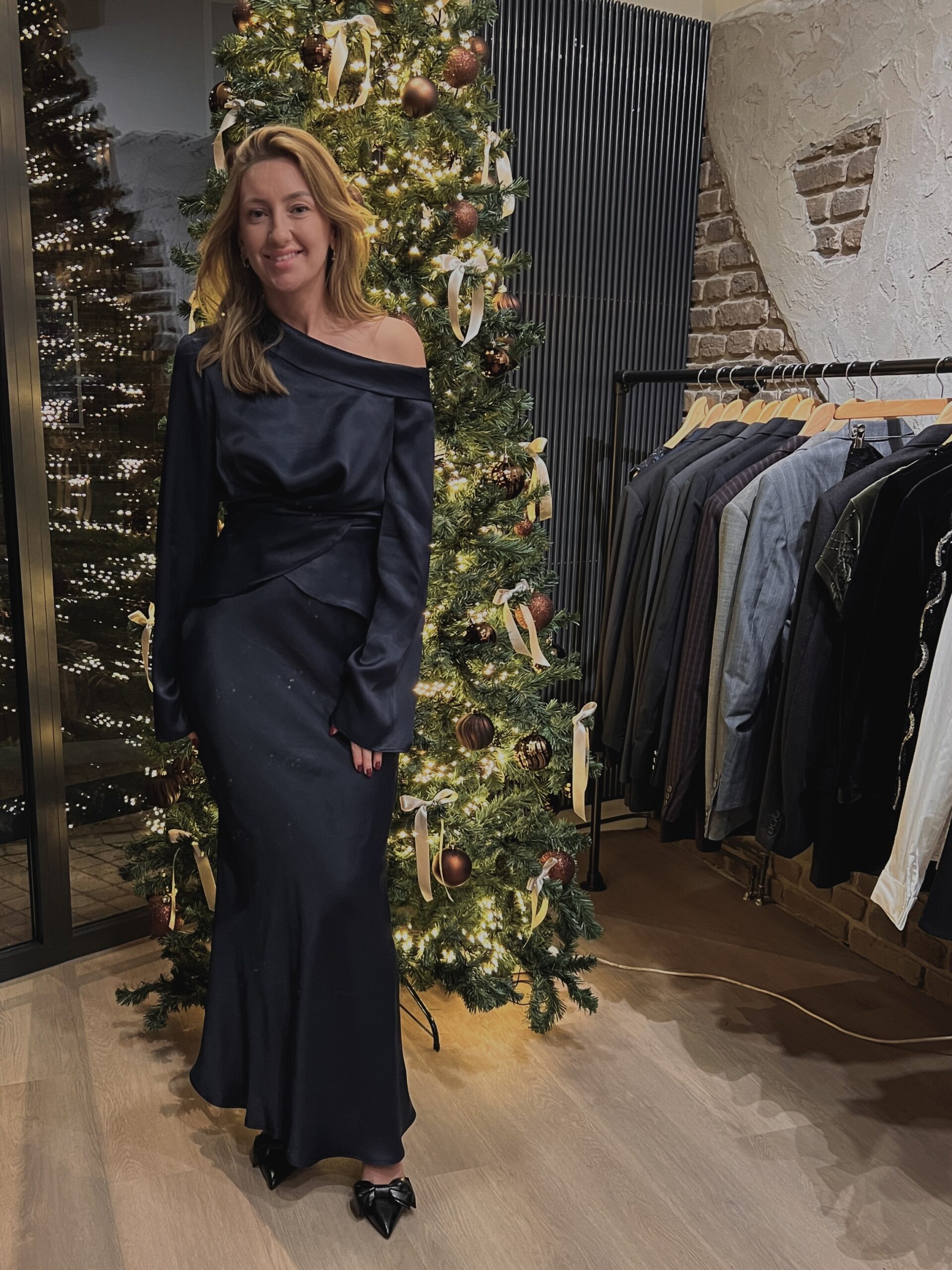 Een elegante blauwe wikkel blouse van 100% viscose, met één blote schouder en een verstelbare striksluiting.